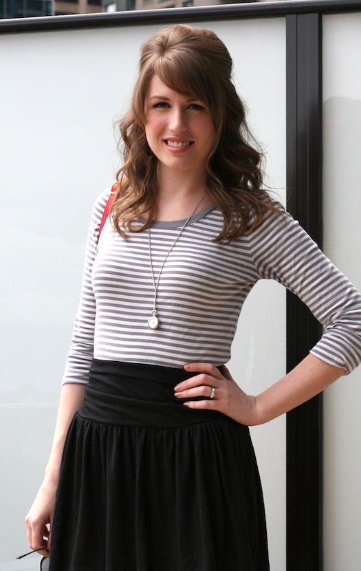 Here's the outfit I wore on my Zooey Deschanel hair day. I'm sure she would have been able to make it quirkier with, I don't know, suspenders or something, but this is as quirky as I can muster, Buster.